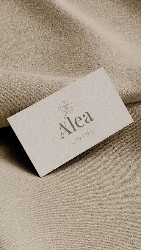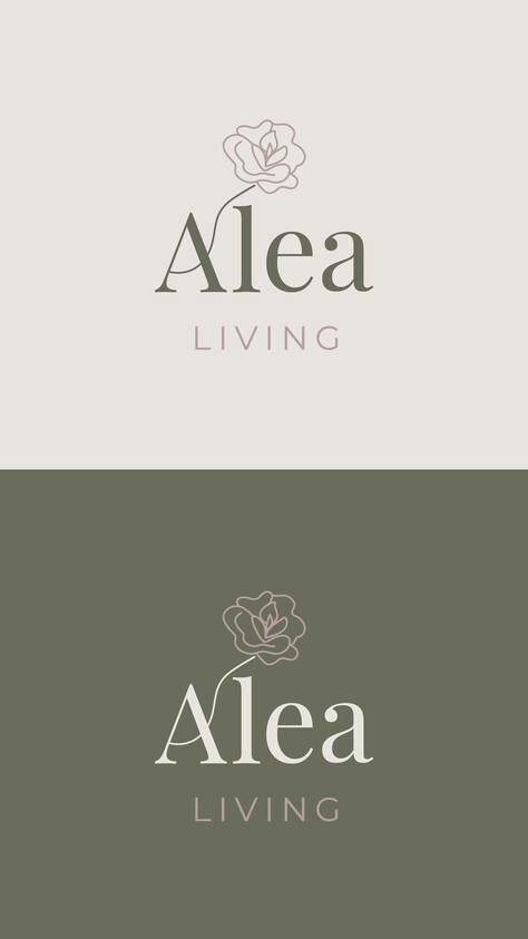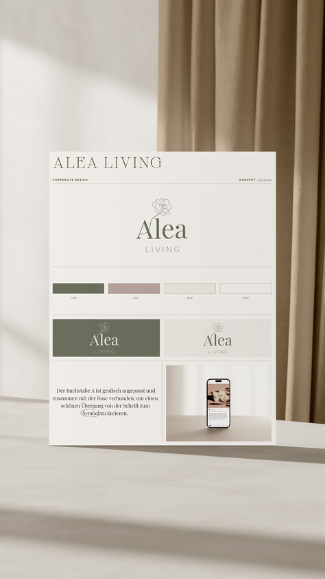 Das Logo ist zeitgemäß, persönlich und elegant konzipiert. Die Typografie wirkt edel und harmoniert mit der individuell erstellten Rose, der „Alea“. Die Farben sind ruhig und wirken erdend. Das Rosé gibt einen schönen Kontrast zum gewählten Grünton. Der Buchstabe A ist grafisch angepasst und zusammen mit der Rose verbunden, um einen schönen Übergang von der Schrift zum Symbol zu kreieren.