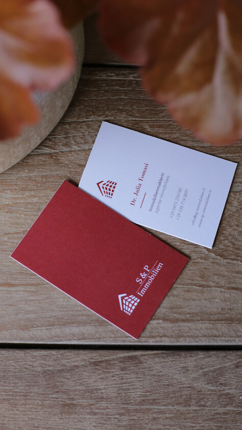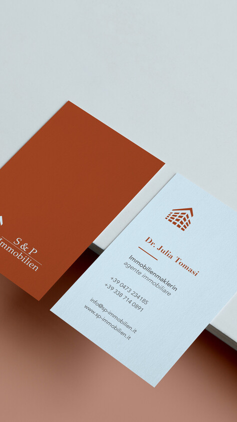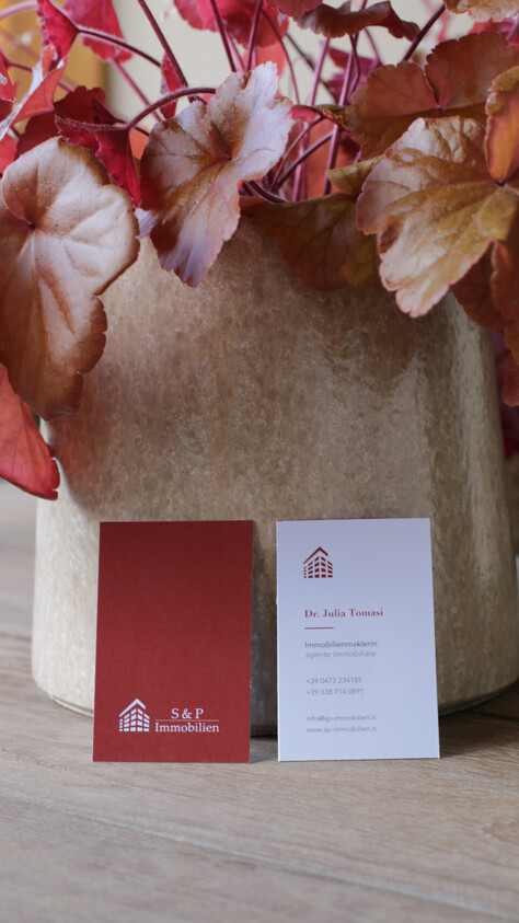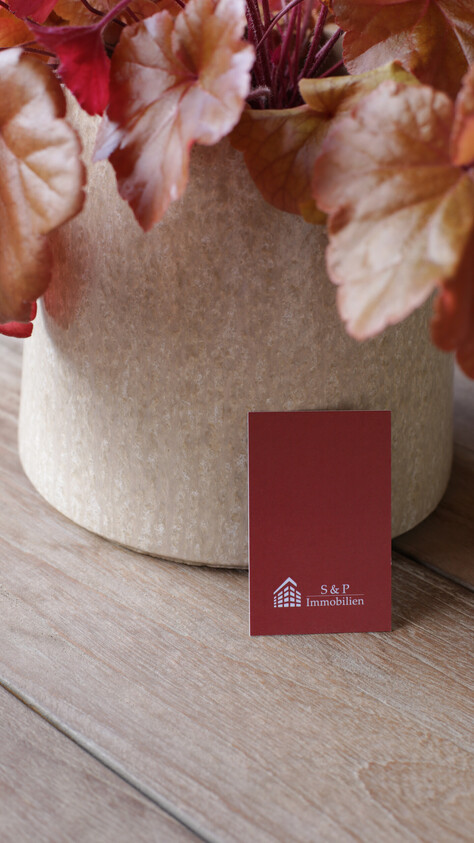 Bereit für neue Kontakte und Immobilienbesichtigungen – Die neuen Visitenkarten in rostrot und hellblau sind mit diesem stimmigen Farbkonzept zu einem echten Eyecatcher geworden. Das gewählte Naturpapier weist eine angenehme und hochwertige Haptik auf.